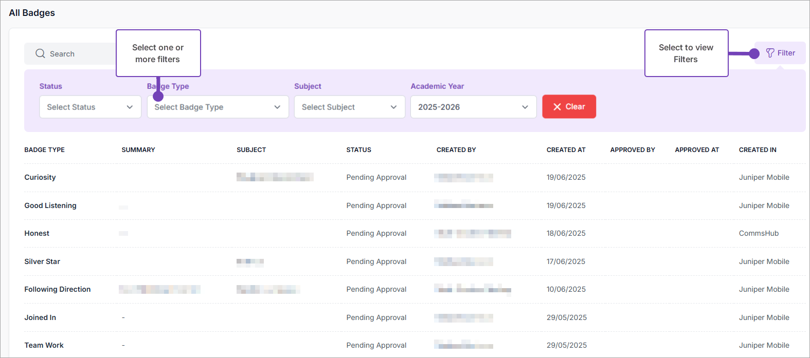 Select Filter to filter badges by Status (Pending Approval, Approved or Declined), Badge Type, Academic Year and Subject.