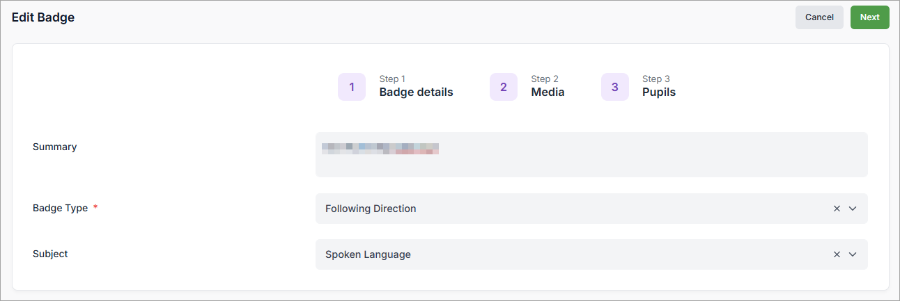- Make any changes to the Summary, Badge Type or Subject as required: