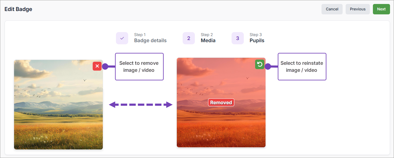Review any media (images or videos) as required. Select an image / video to remove it from the informal observation. It will be overwritten with the word Removed, if it has been removed. If an image / video is removed in error, select it to reinstate it: