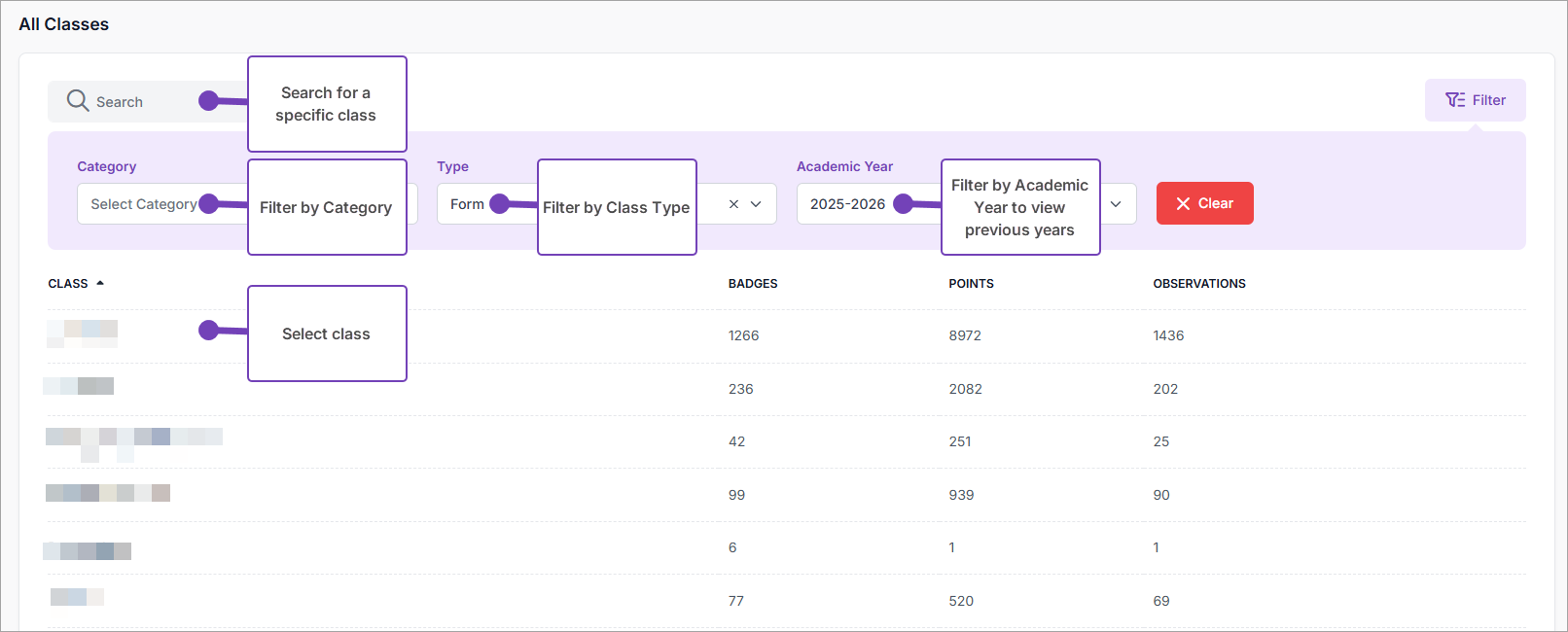You can view badges awarded for pupils in the current academic year for all your classes. If you are looking at previous academic years, you will only be able to see the classes that you taught in that academic year. You will only be able to see badges for pupils that you taught in those previous years, not the pupils you currently teach (unless you previously taught them in other classes).