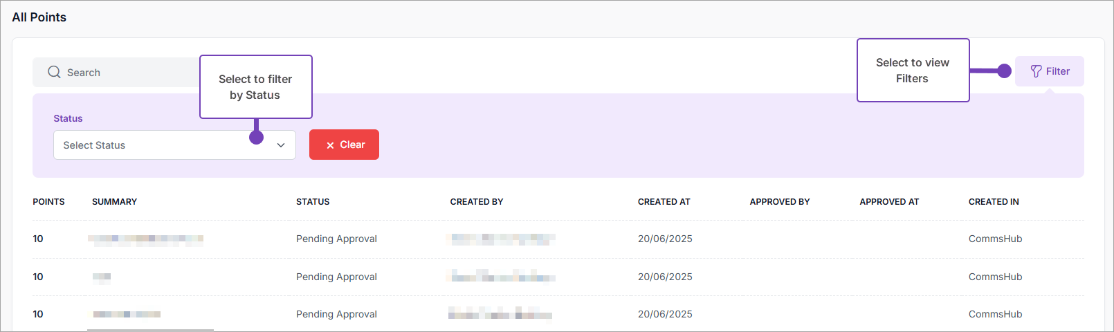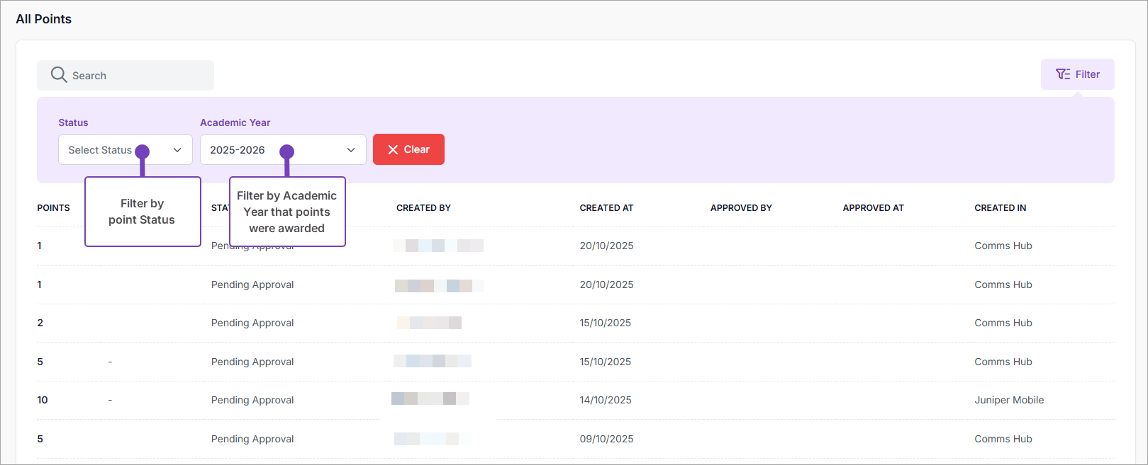 This article explains how to view all points. You'll find a list of all awarded points, whether they are pending, approved, published, or declined, along with details for each point awarded.