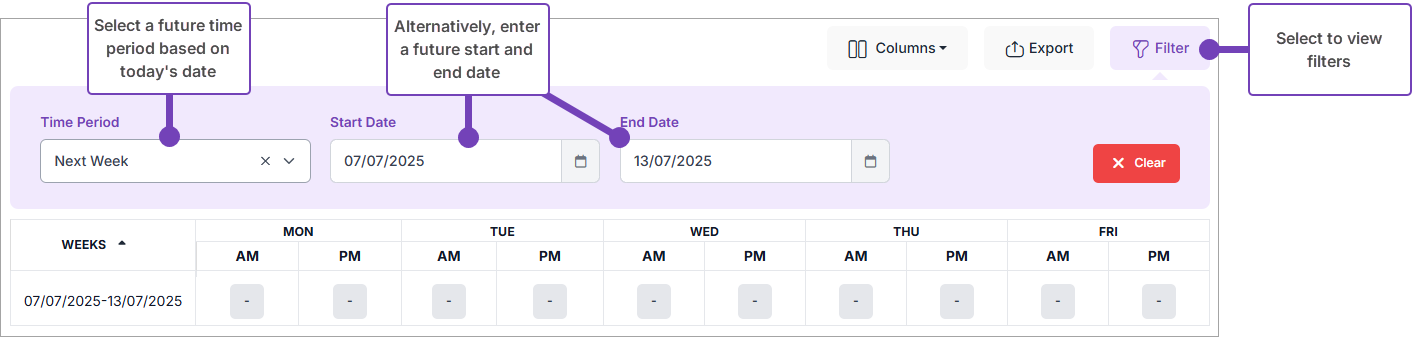 - Locate the future date(s) where you want to add the future approved absence, using either the Time Period, or the Start Date and End Date filters: