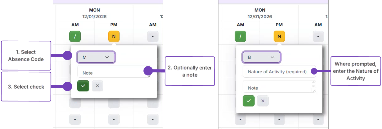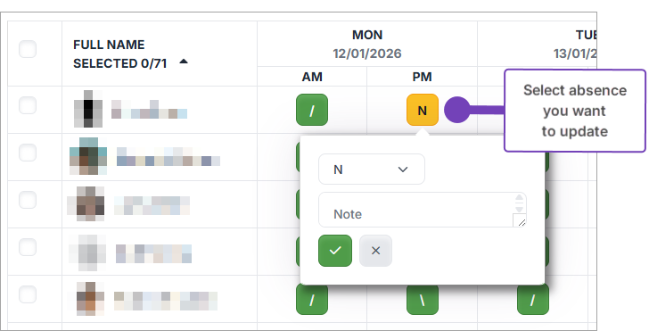 - Select the absence you want to add / update: