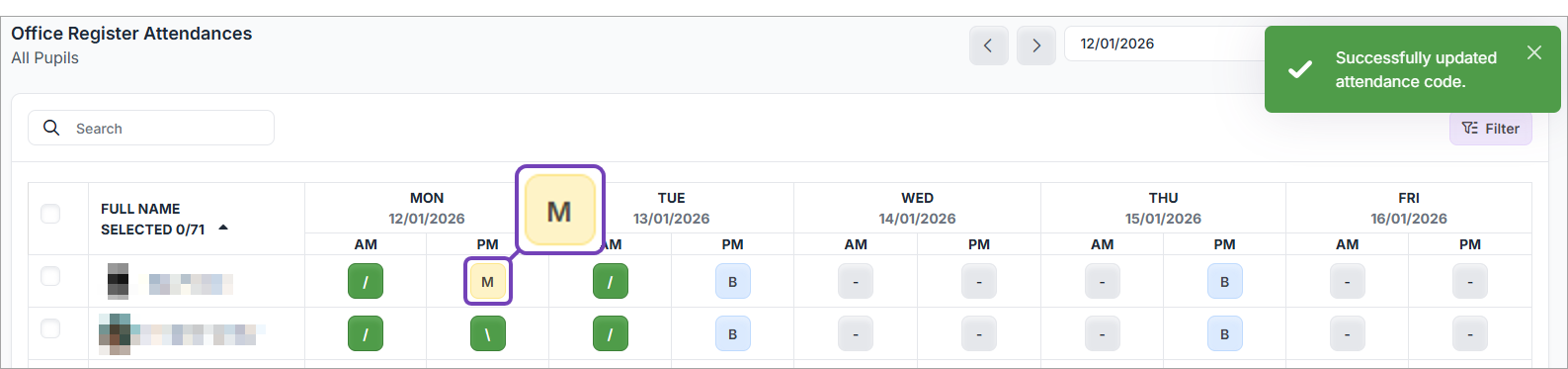 Add / update a pupil's absence code