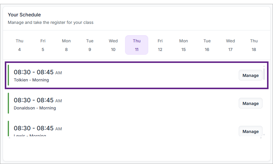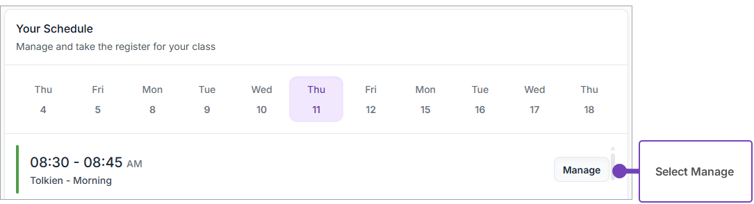 - Select Manage next to the class: