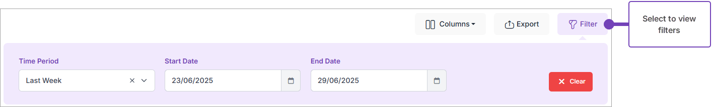 - Locate the date(s) where you want to make an update to the absence, using either the Time Period, or the Start Date and End Date filters: