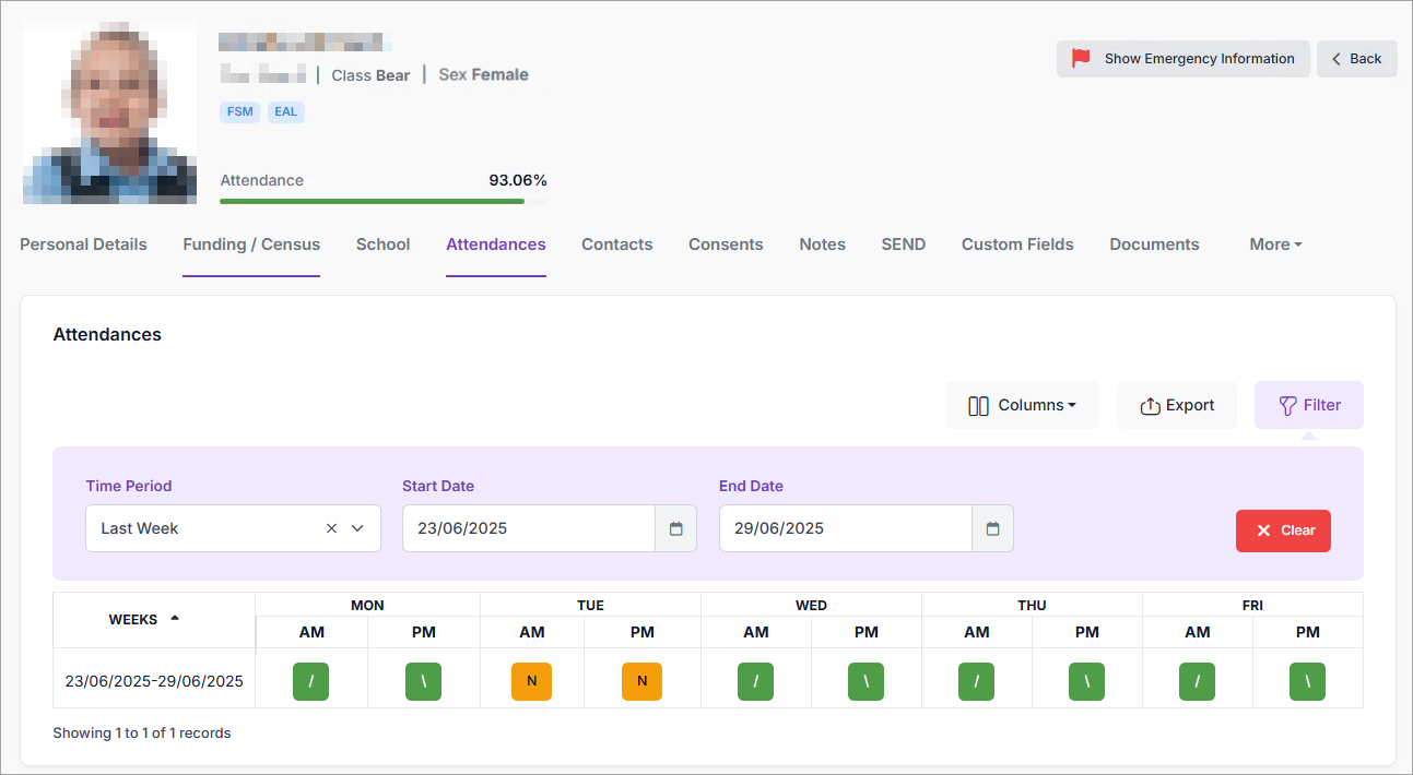 - From the Pupil details, select the Attendances tab: