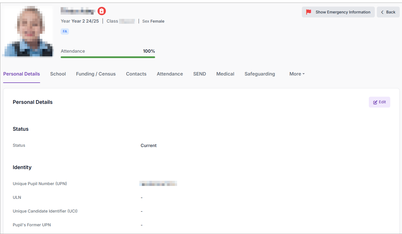 The pupil's record / profile is displayed: