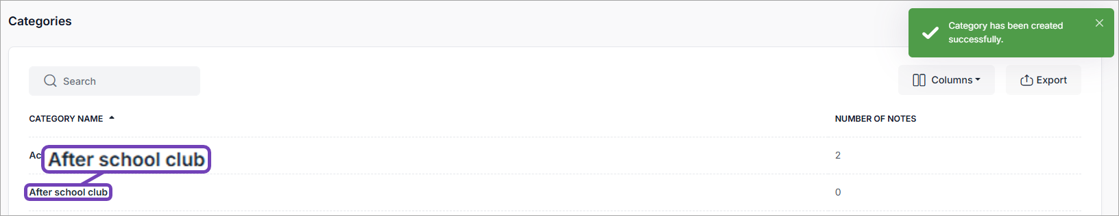 The Note Category is created. A message confirms this, and the new Category is listed in the Categories page: