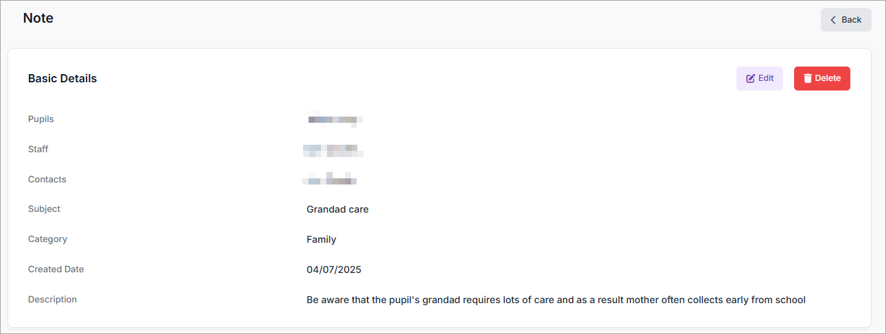 Where multiple pupils are listed on a note, deleting the note from one pupil's profile will delete the notes for all named pupils.