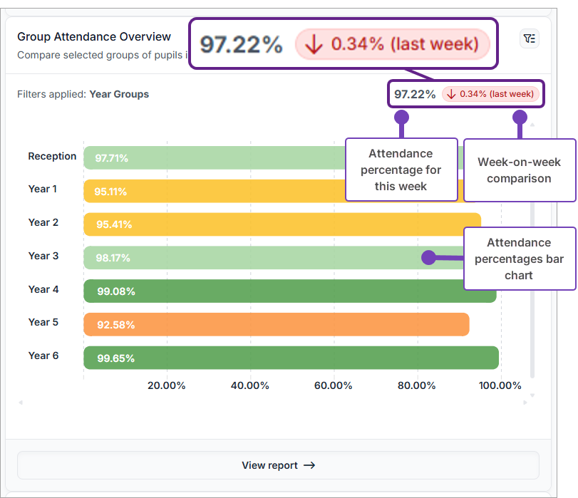This article explains how to see year-to-date attendance by year group using the Group Attendance Overview widget in the Attendance Dashboard.