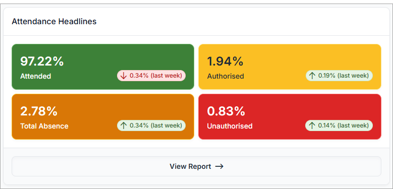 This article explains how to view this week's attendance headlines for the whole school using the Attendance Dashboard. The dashboard shows a week-on-week comparison for each headline figure.