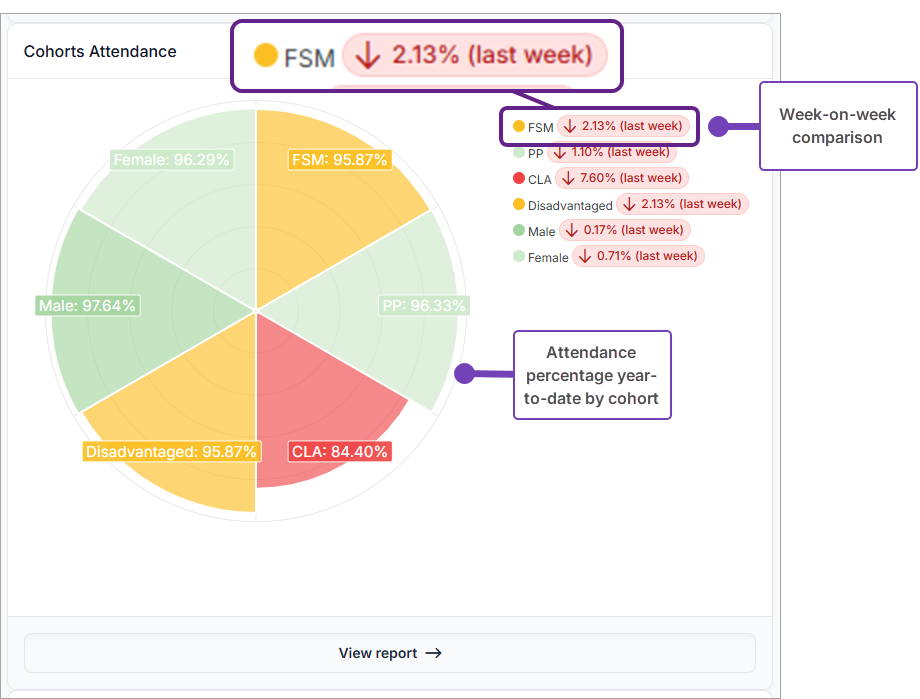 The Cohorts Attendance widget shows the year-to-date attendance percentage of the different pupils across the whole of your school based on their characteristics: