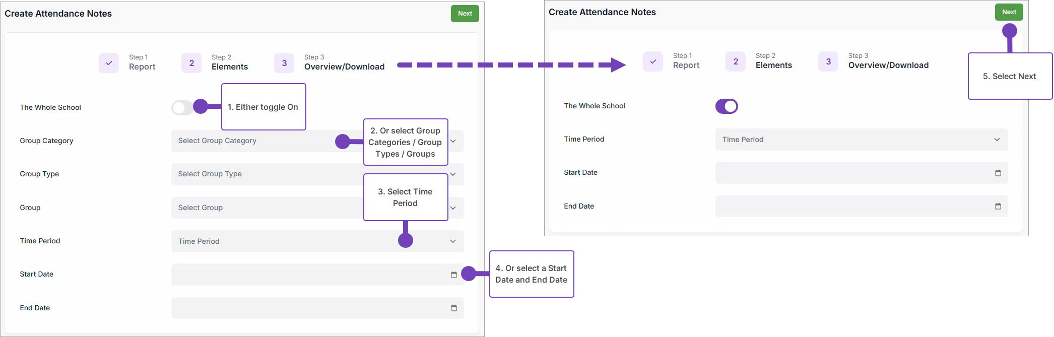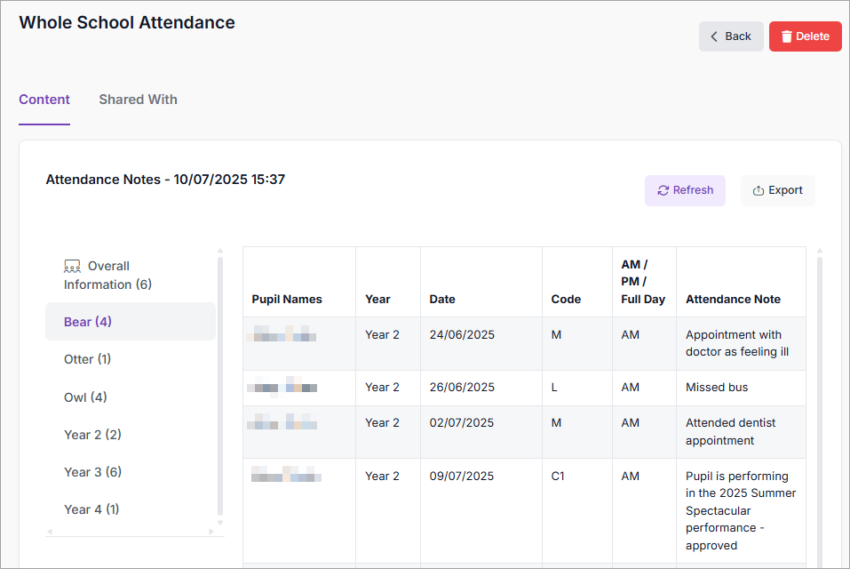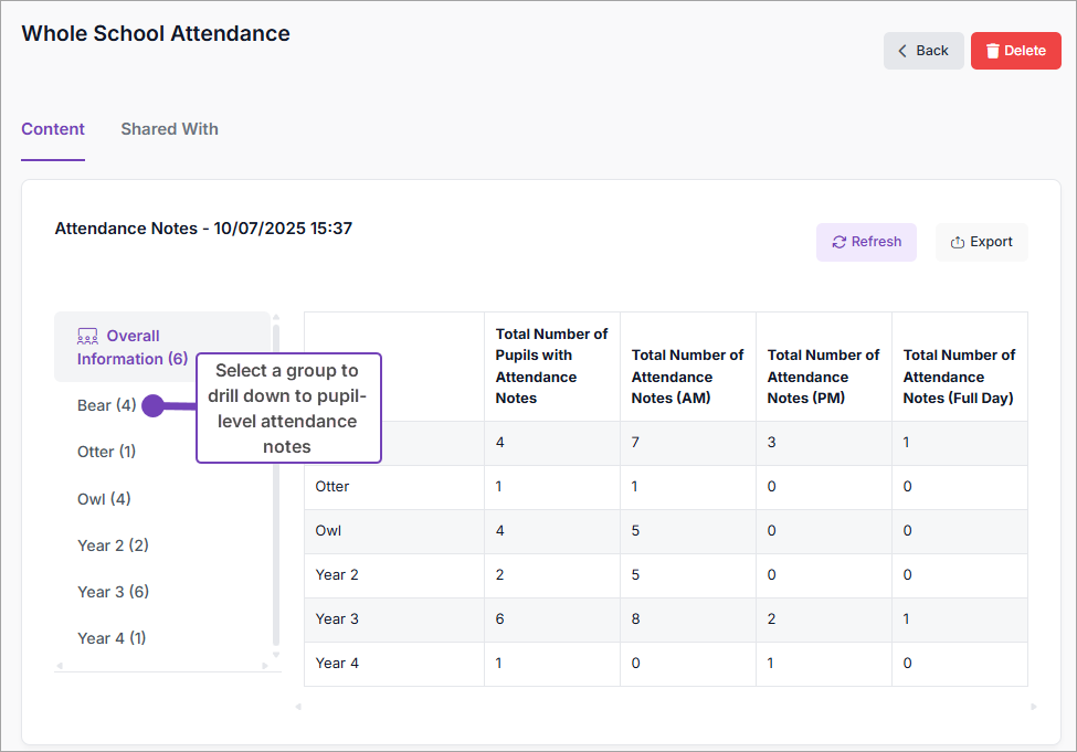 This article explains how to create a report that lets you view attendance notes for pupils within your school. You can create an interactive report for the whole school, or one or more groups. When creating report, you can also specify a time period or a specific date range for the report.