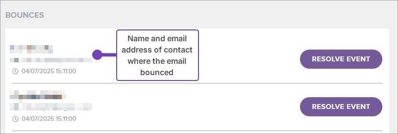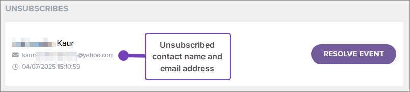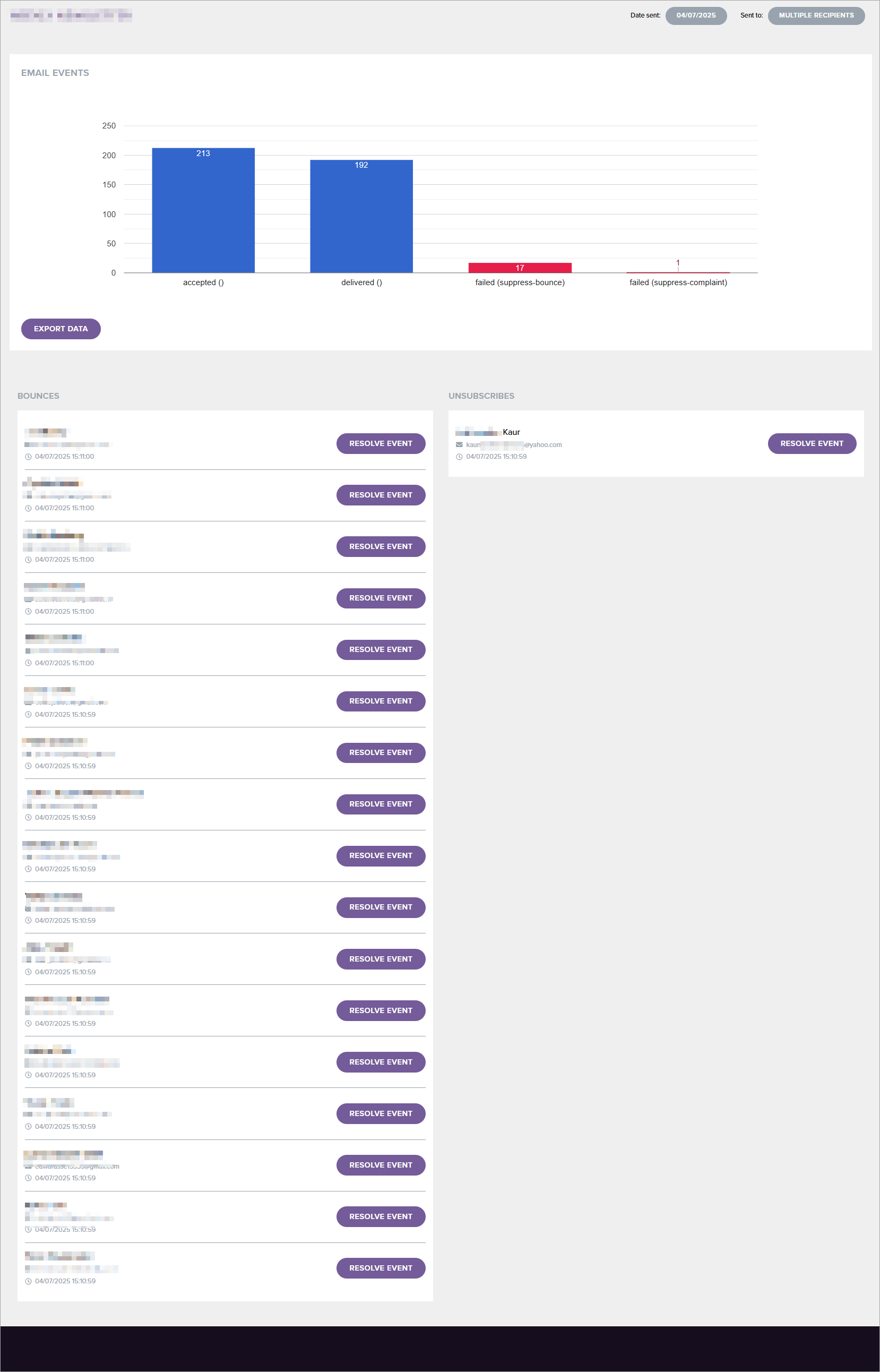 In addition to the names of contacts where emails have bounced when sent, the names of individual contacts who have not received the email because they unsubscribed are also clearly displayed with their email addresses: