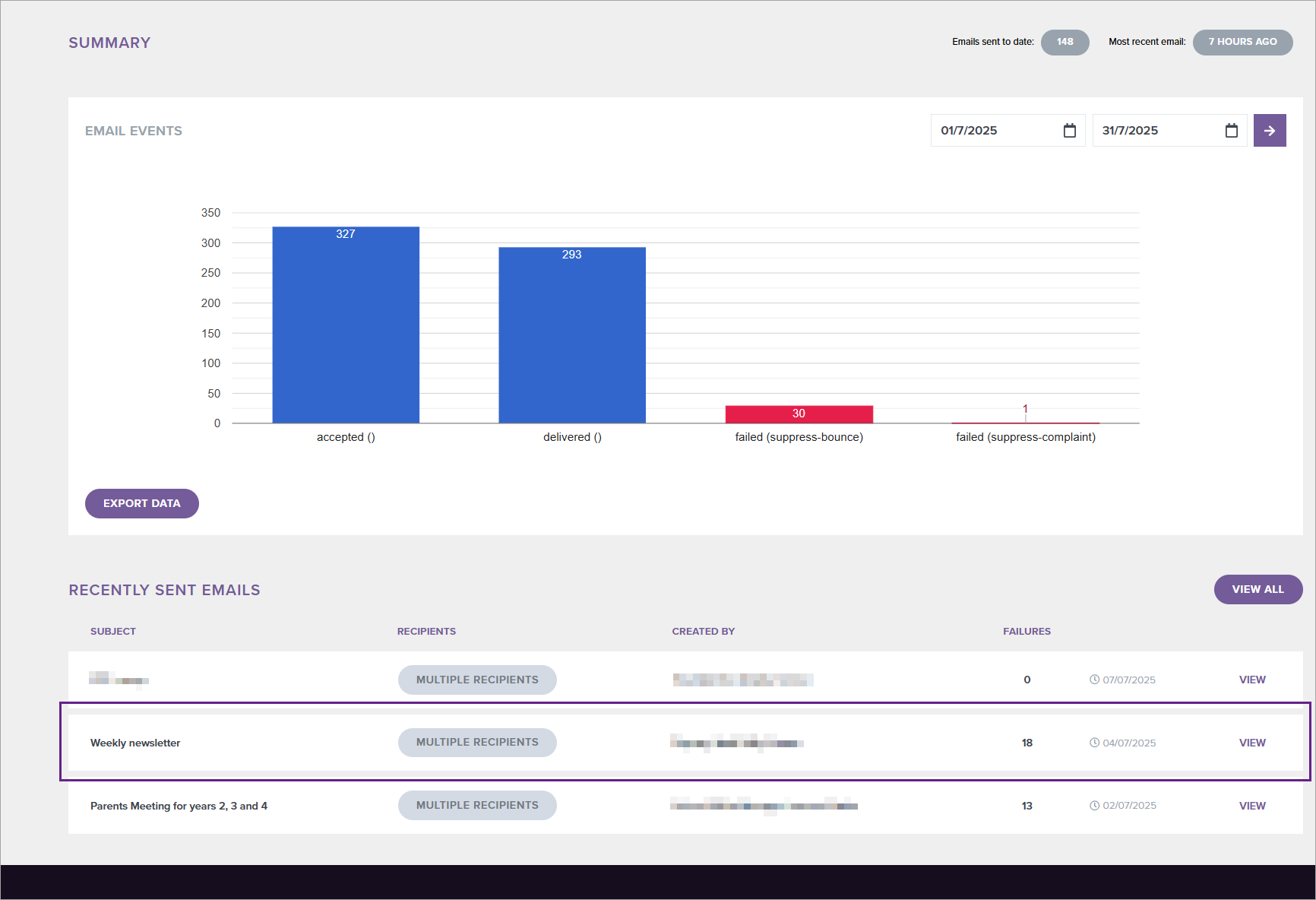 - Scroll down the email page and locate the email that you sent to check why a parent or contact has not received the email: