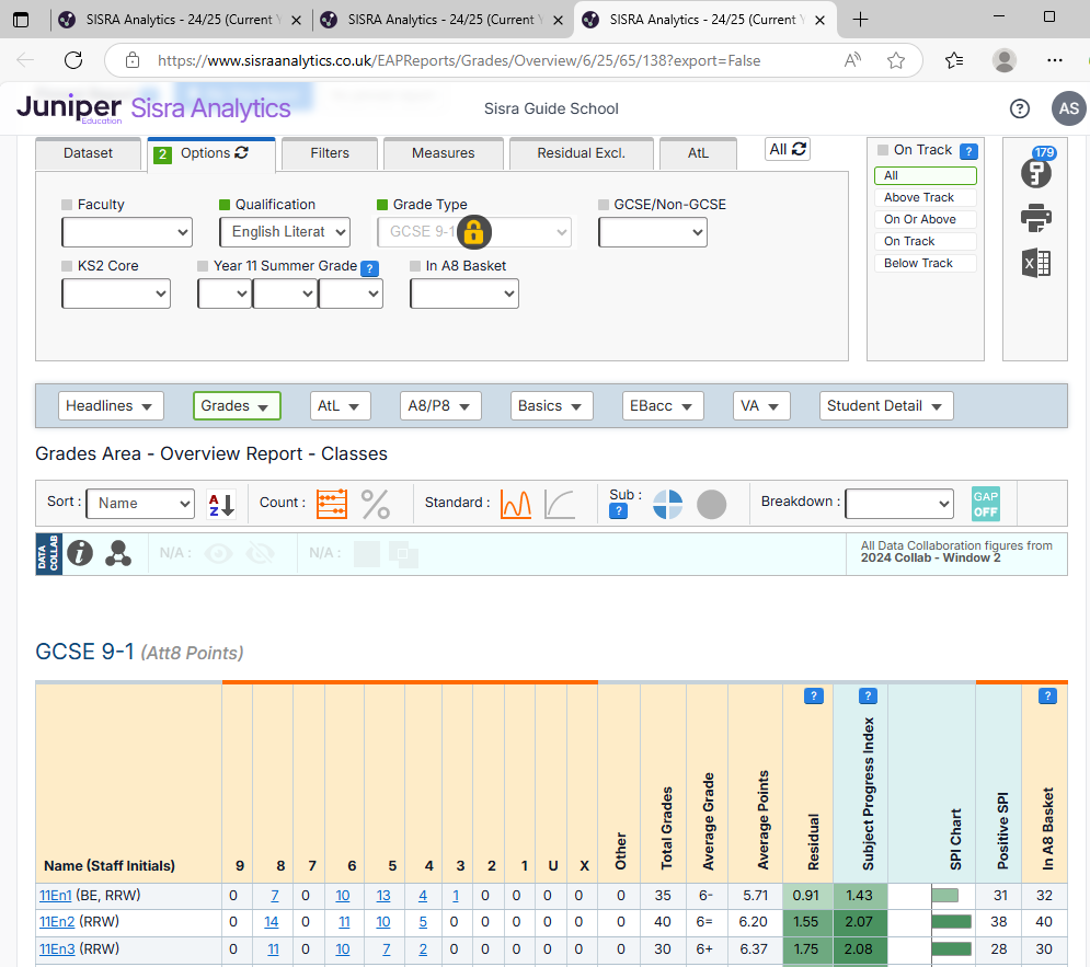 Within the reports showing all qualifications, you can press CTRL + Click on each qualification you wish to analyse and each qualification's report will appear in a separate tab. In this example, we have the Grades Area - Totals - Qualifications report open in KS3/4.