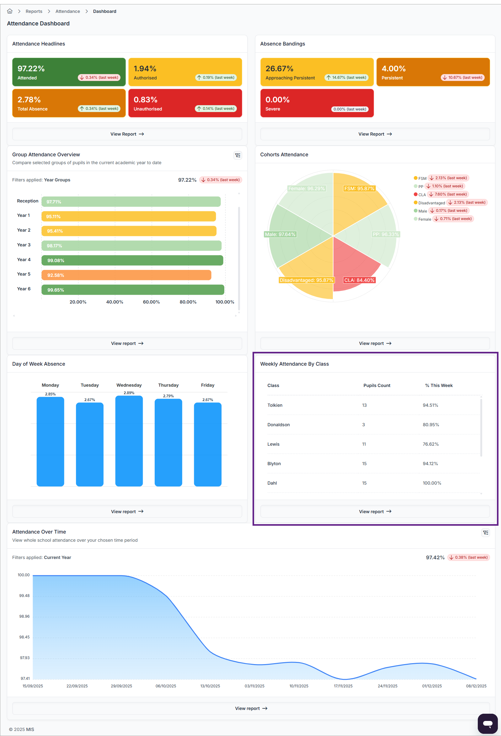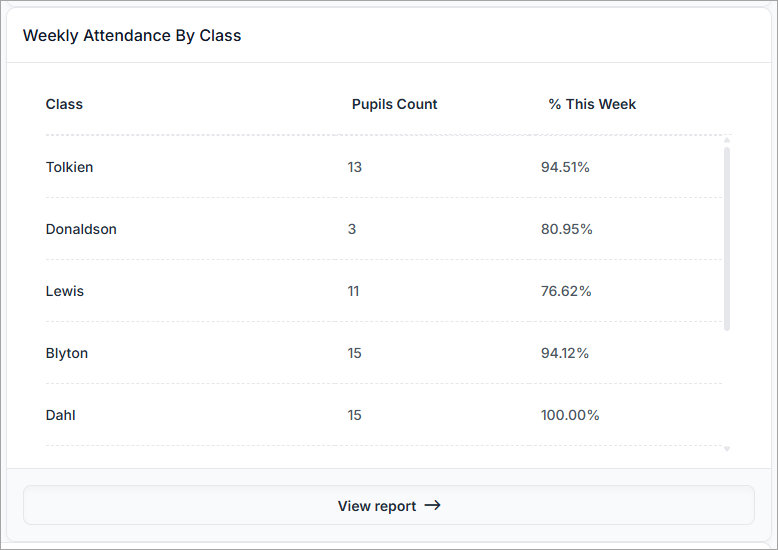 This article explains how to see pupil attendance by class using the Weekly Attendance By Class widget