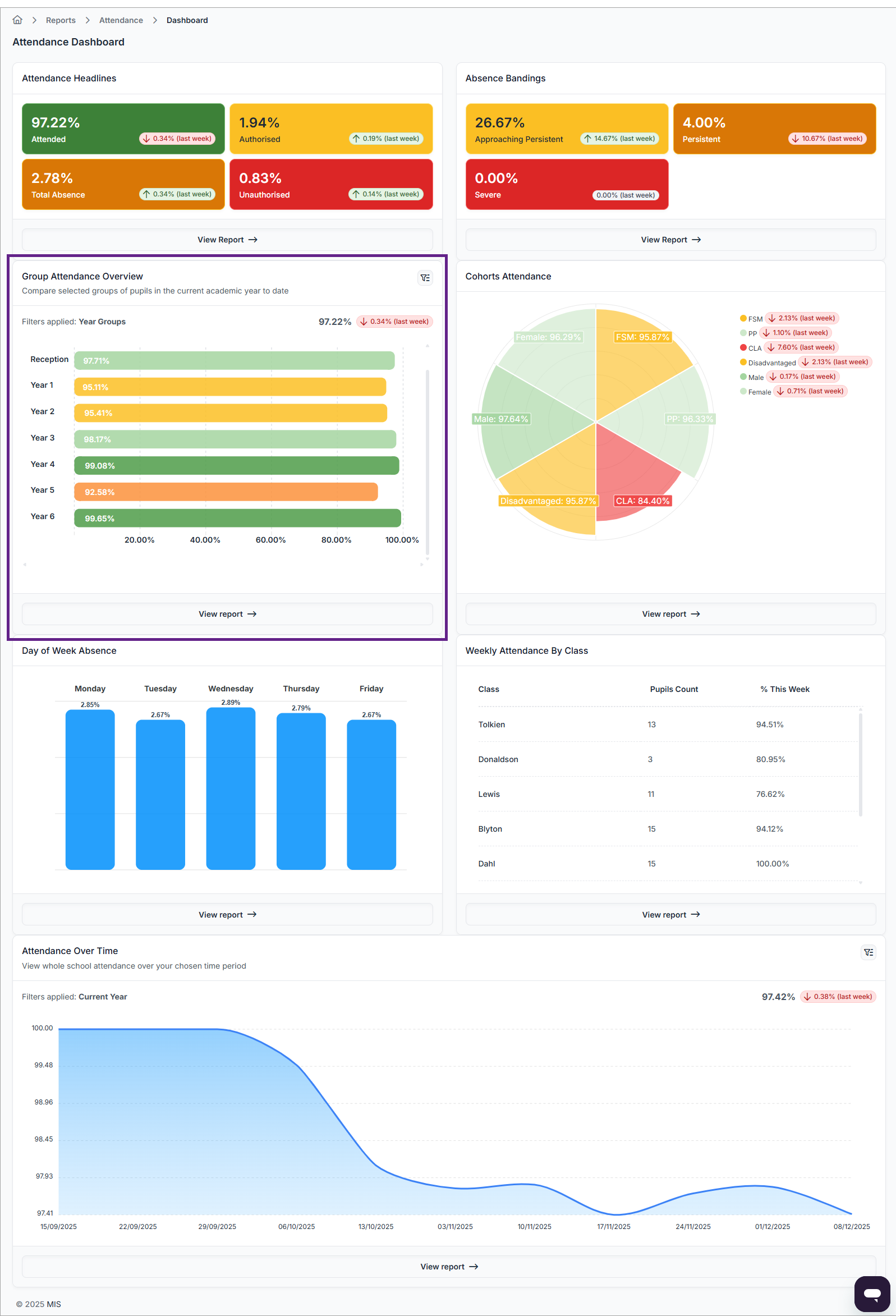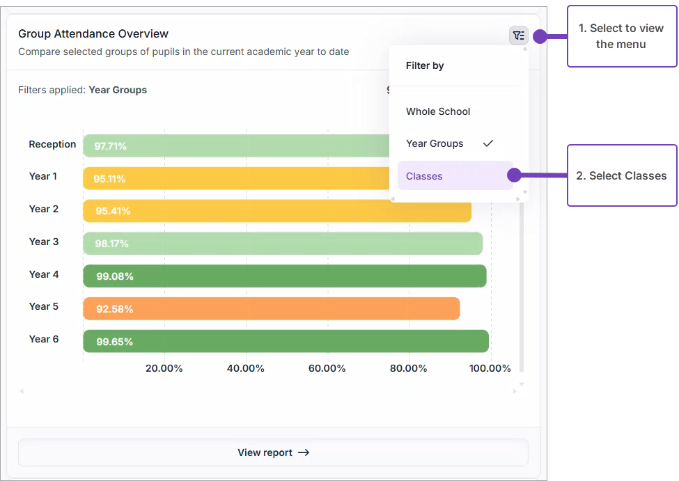 This article explains how to see year-to-date attendance by year group using the Group Attendance Overview widget in the Attendance Dashboard.