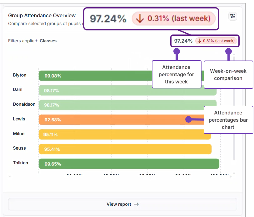 The Group Attendance Overview widget compares year-to-date attendance for each class for the last week. Additionally, you are presented with a comparison of year-to-date attendance for all classes across the school. This compares the last week's attendance with that of the prior week: