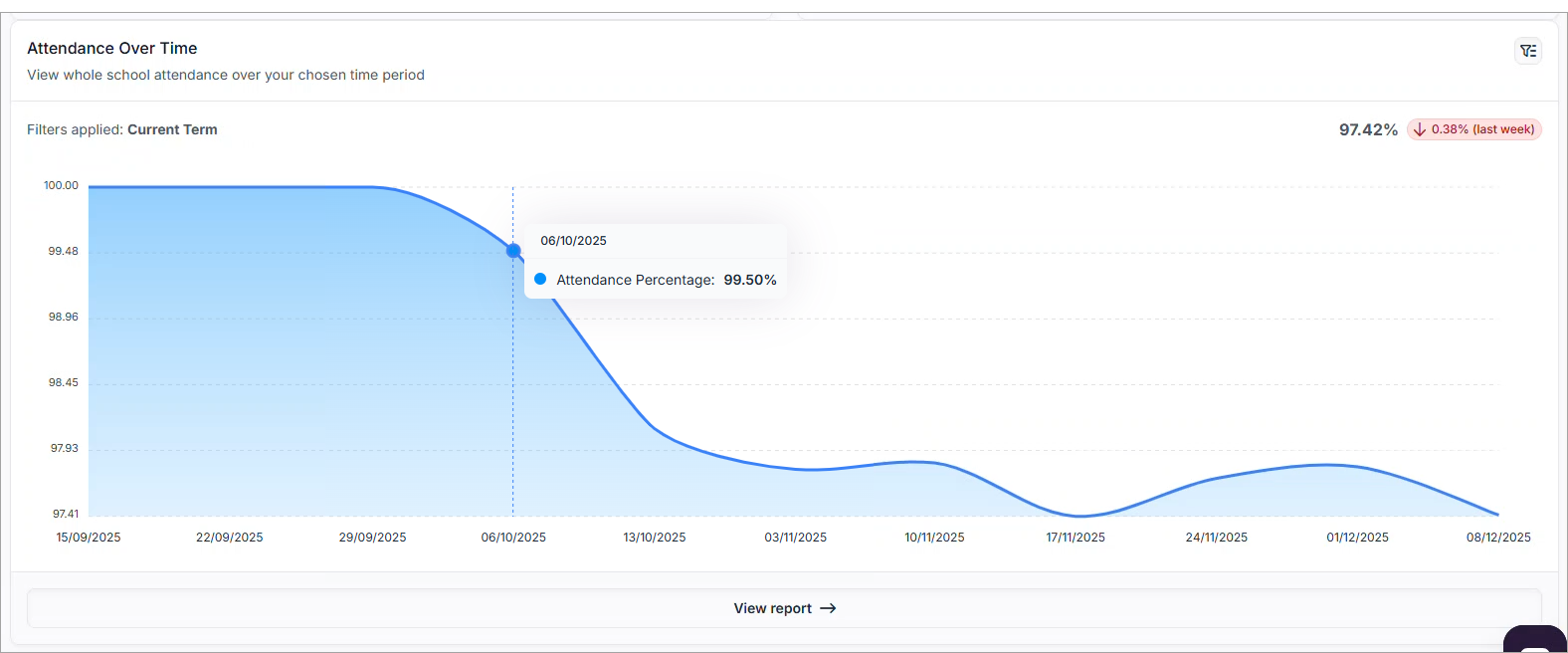 The Attendance Over Time widget shows attendance across the whole school week-by-week for the current term. Additionally, you are presented with a comparison of year-to-date attendance for the whole school with that of the prior week:
