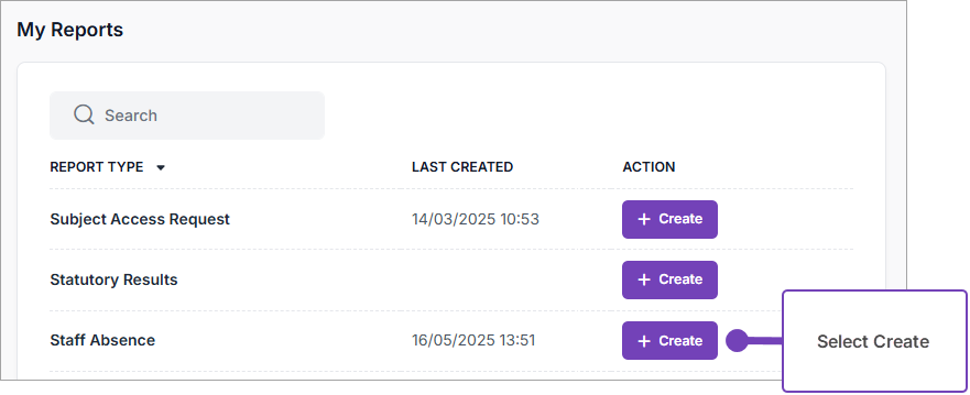 - Locate the type of report that you want to create from the list of reports, for example, Staff Absence.