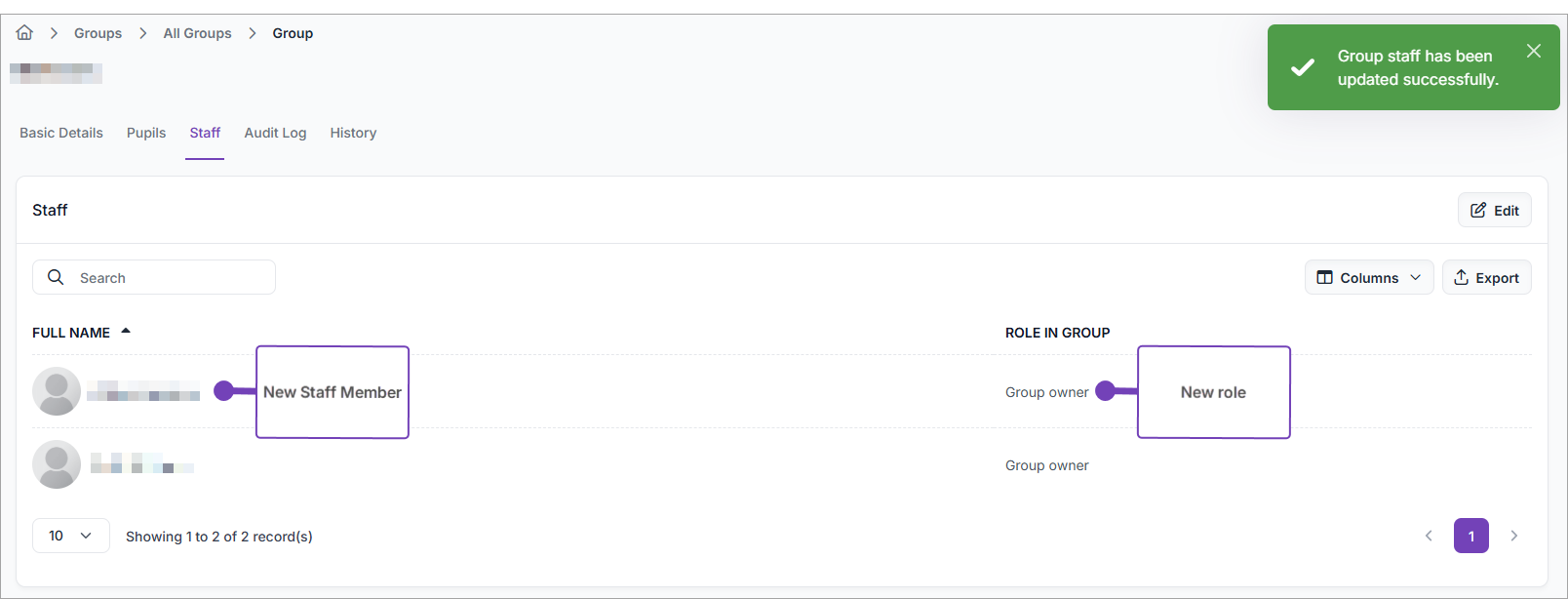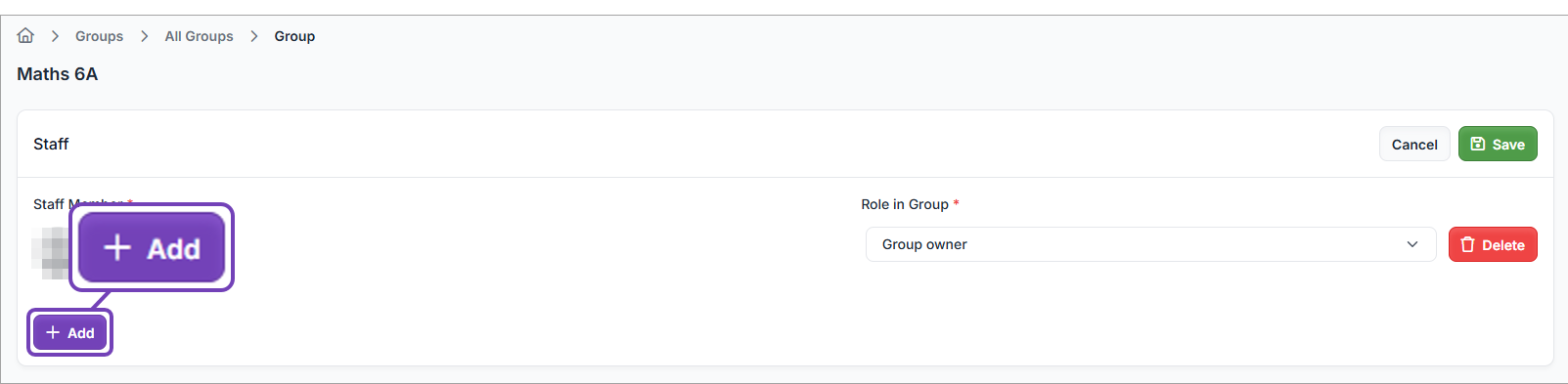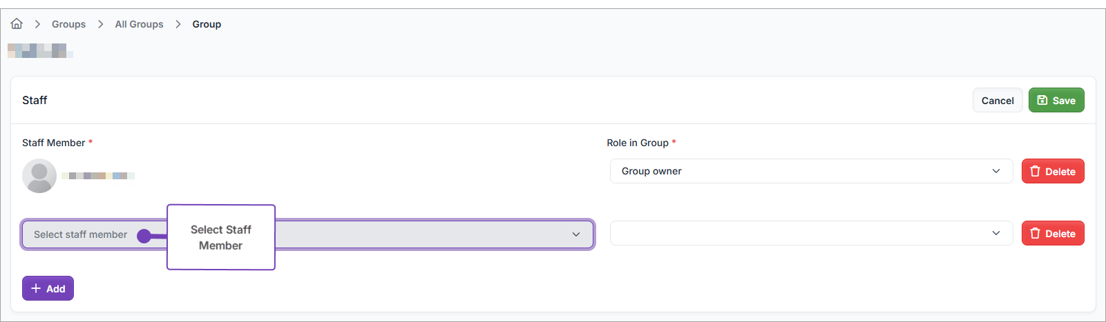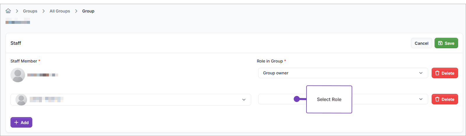 - Allocate the staff member a Role in the Group from Group owner, Group editor, or Group viewer: