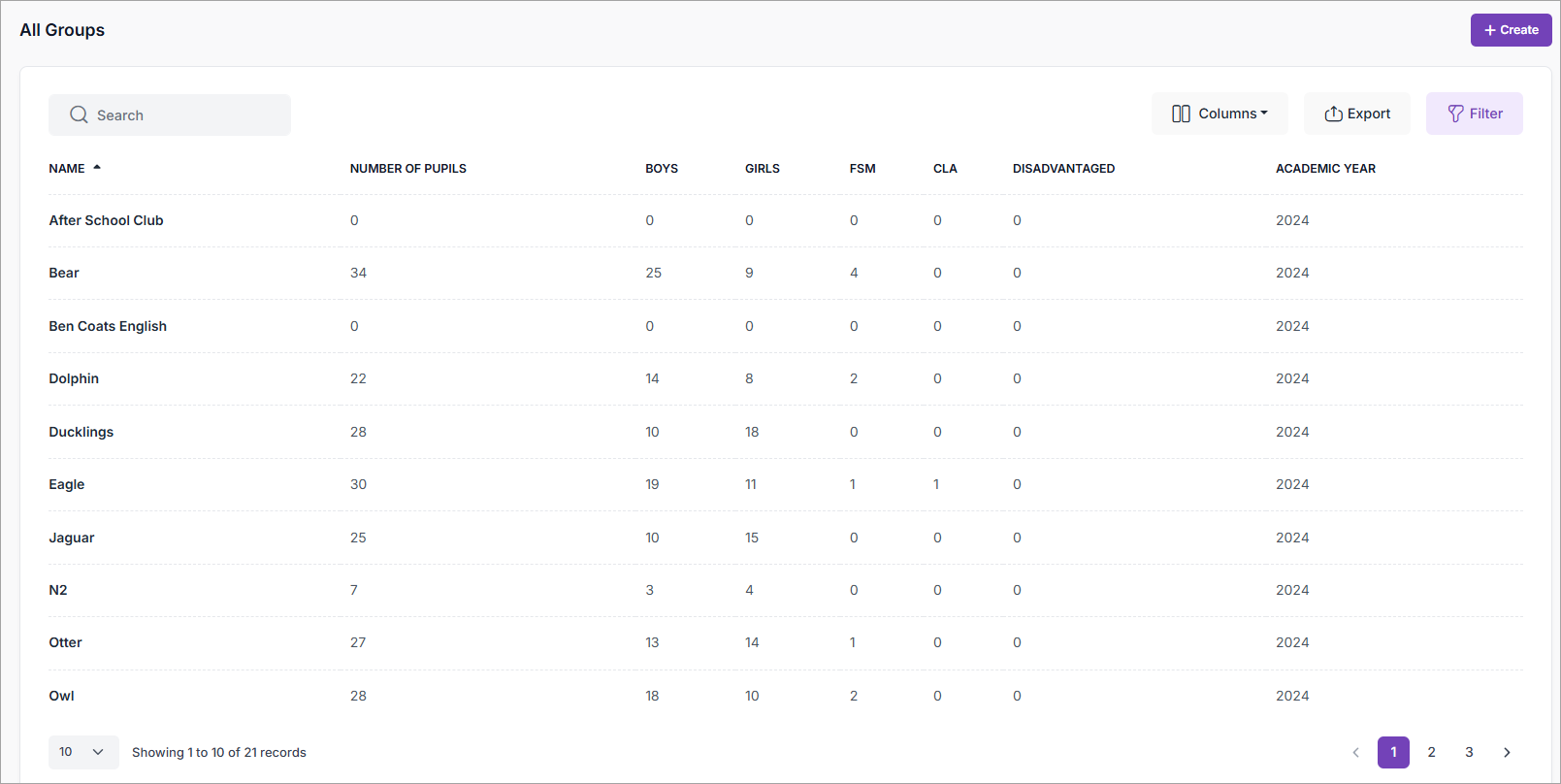 A list of either all groups or the groups within a specific group type selected is displayed. The list contains the number of pupils and their key characteristics (Boys, Girls, FSM, CLA, Disadvantaged), along with the Academic Year associated with each Group:
