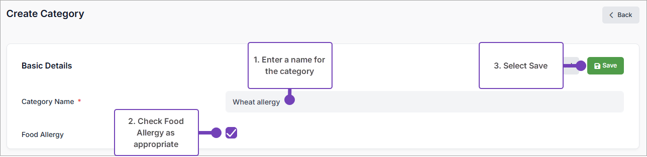 - If the category you are creating is for a medical condition considered a food allergy, check Food Allergy.