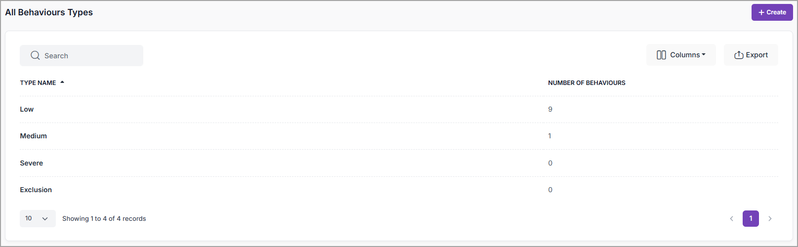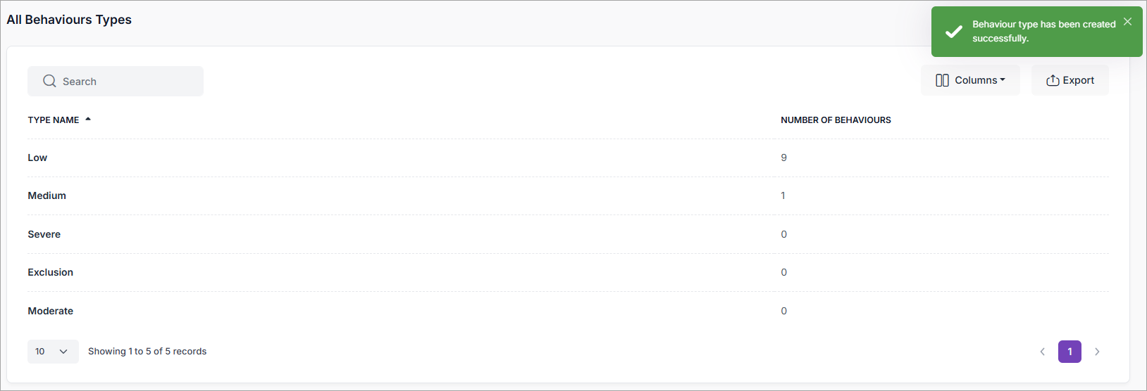 The Behaviour Type is created, ready for selection when creating Behaviour Categories: