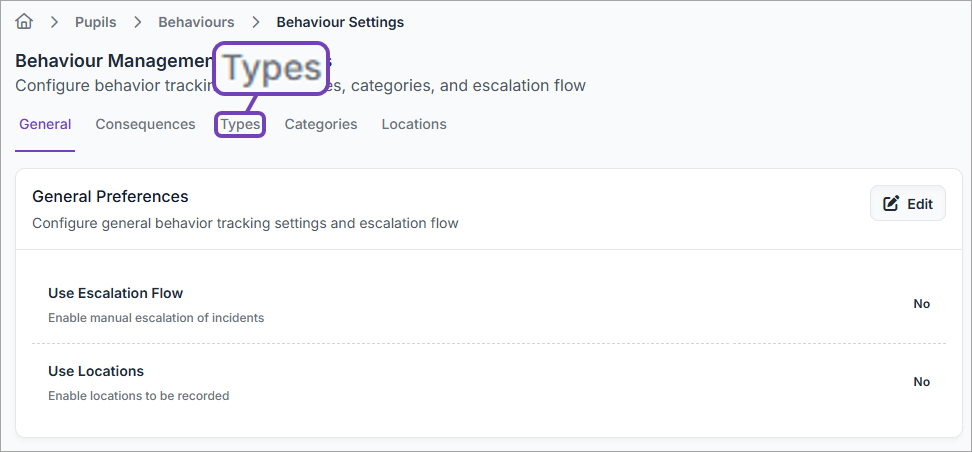 This article explains how to add a Behaviour Type within Juniper MIS. Behaviour Types are selected when creating Behaviour Categories and are used to group behaviours when reporting. Examples of Behaviour Types are High-Level, Low-Level, and Severe.