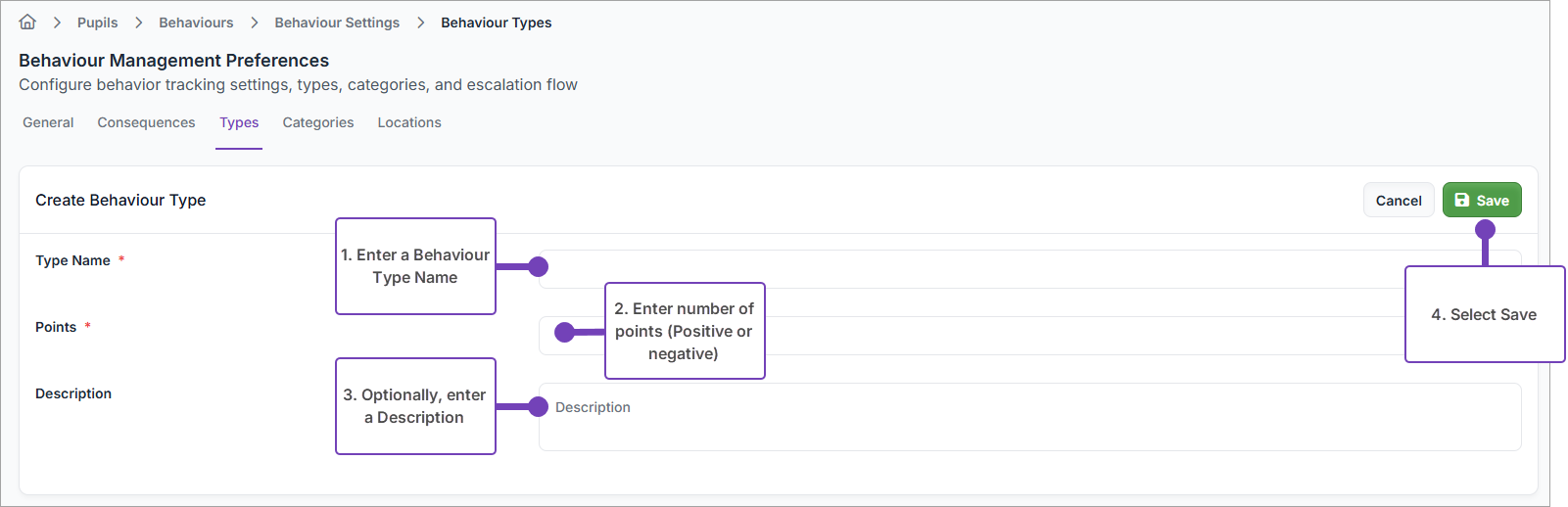 2. Enter the number points associated with the Behaviour Type (this can be zero, or a negative or positive value).