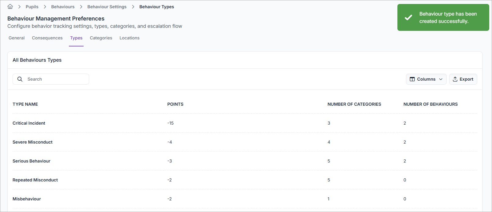 The Behaviour Type is created (a message confirms this), ready for selection when creating Behaviour Categories: