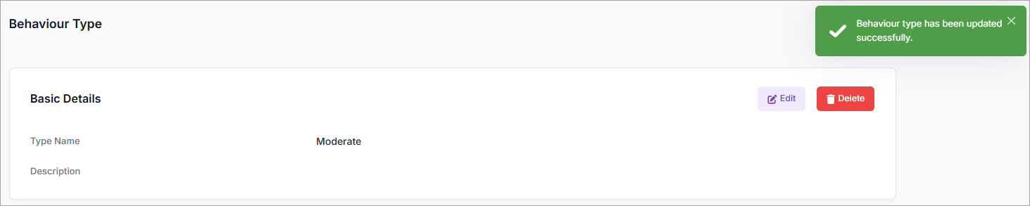 The Behaviour Type is updated with the changes. A message confirms this as you are returned to the Behaviour Type: