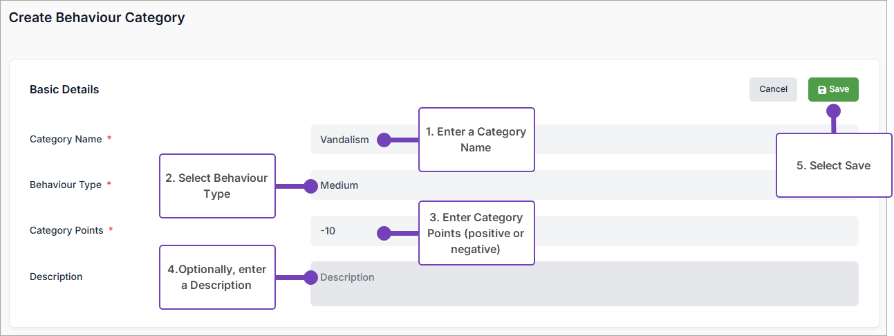 - Enter Category Points (points awarded or deducted when this category is used to record pupil behaviour). You can enter either a positive or negative value for the points.