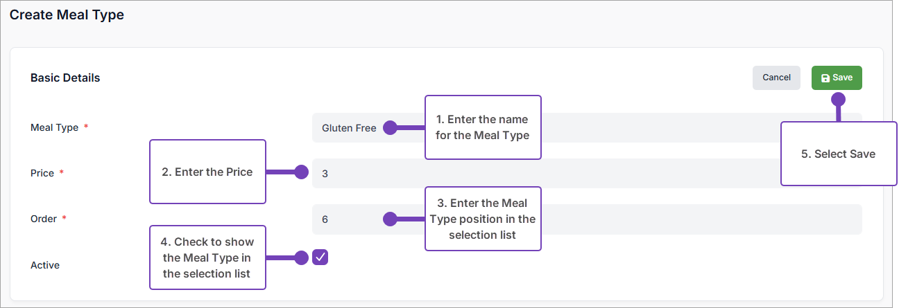 4. Check Active to make the Meal Type active (so that it appears in any meal selection menu).