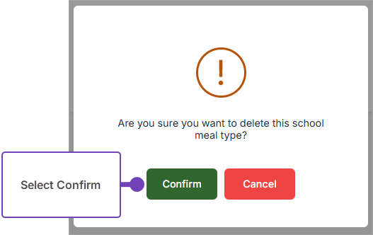 - The system checks to see whether the Meal Type is in use. Where the Meal Type is not in use, select Confirm to delete: