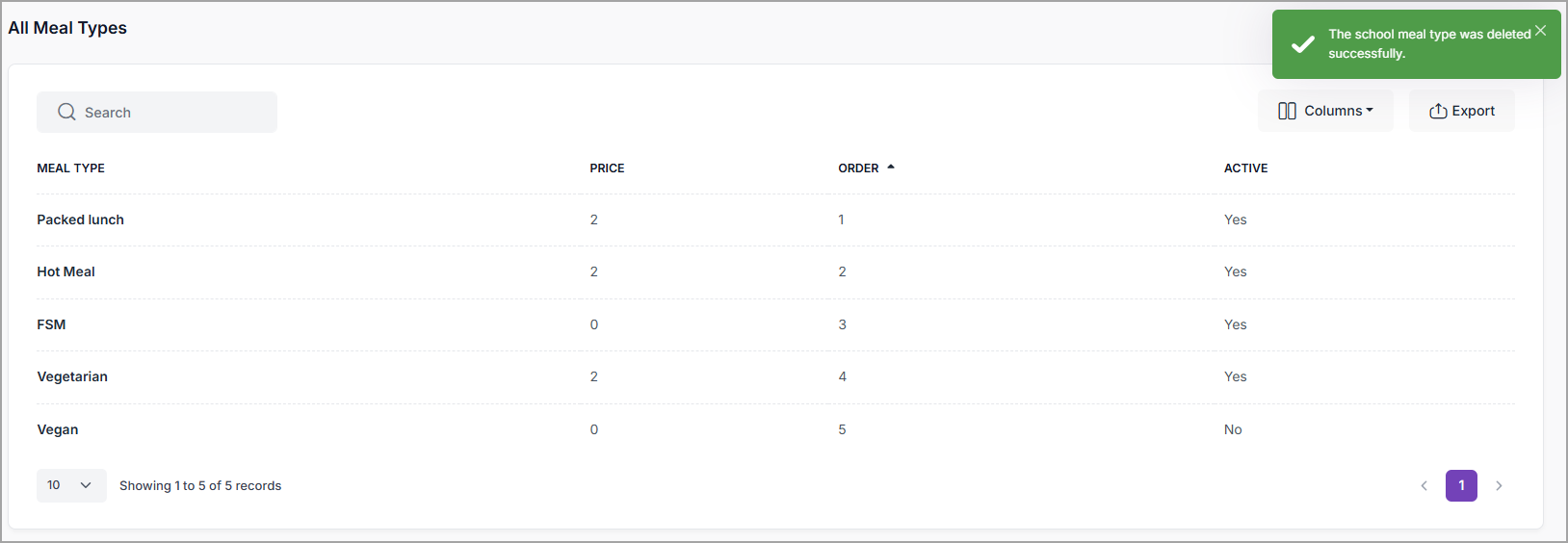 Where the Meal Type is not in use, it is deleted: