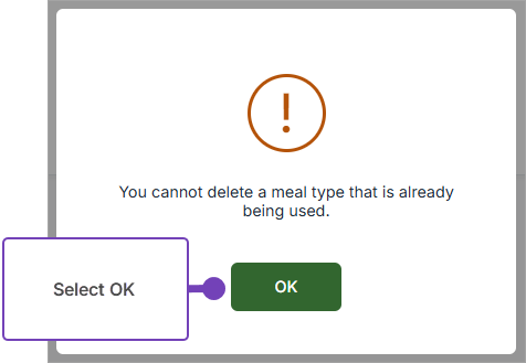 If the Meal Type is in use, a warning message advises that it cannot be deleted - select OK to continue: