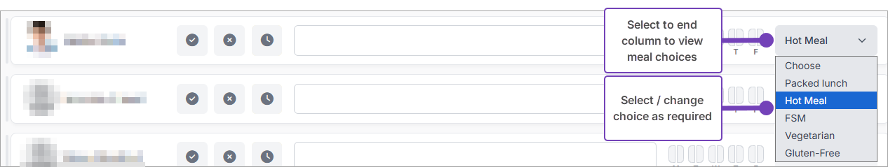 - For each pupil, select the end column to record / update / change their meal choice. The pupil is automatically marked present for the morning session when changes are made. The meal types are customised for your school: