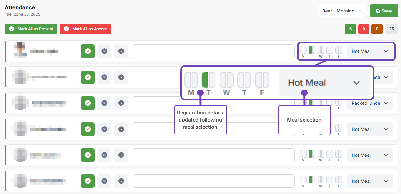After saving the register, pupils’ meal choices will be available for office and kitchen staff to view.