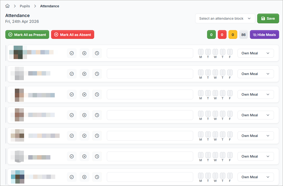 When the attendance register loads, pupils' meal choices are either pre-filled based on a default meal plan (if configured) or empty (displayed as Choose):