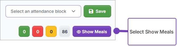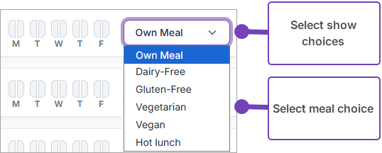 - For each pupil, select the end column to record, update or change their meal choice as needed. The pupil is automatically marked present for the morning session when changes are made. The meal types are customised for your school,based on available meals for the day: