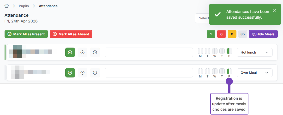 After saving the register, pupils’ meal choices will be available for office and kitchen staff to view.