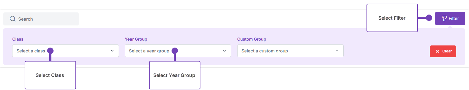 - To narrow the names displayed to a specific class or year, select Filter, then select a Class or Year Group: