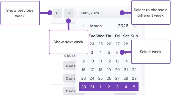 - Navigate to a previous week using the date picker, or the < and > arrows:
