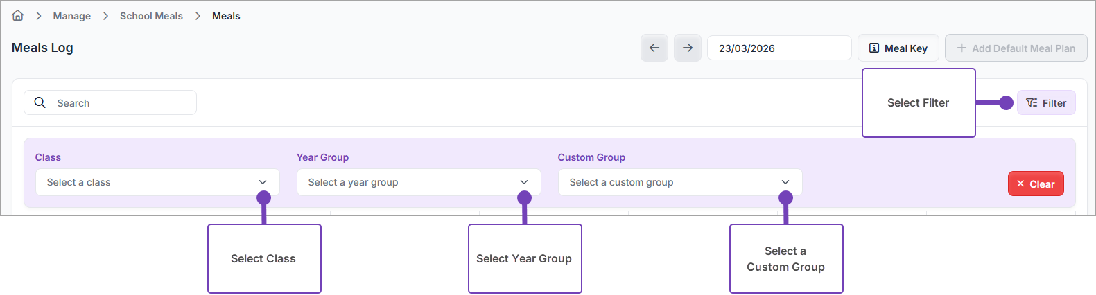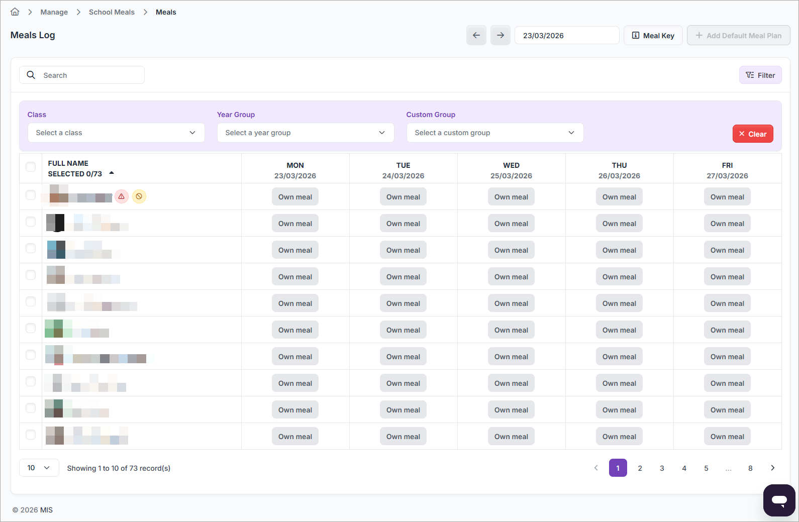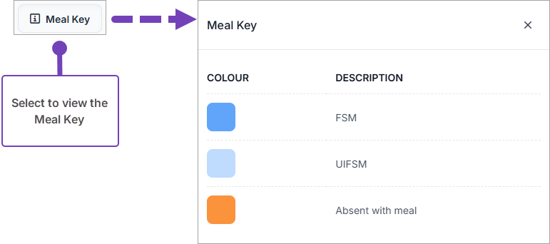 To view the meanings of the various codes listed next to pupils, select Meal Key: