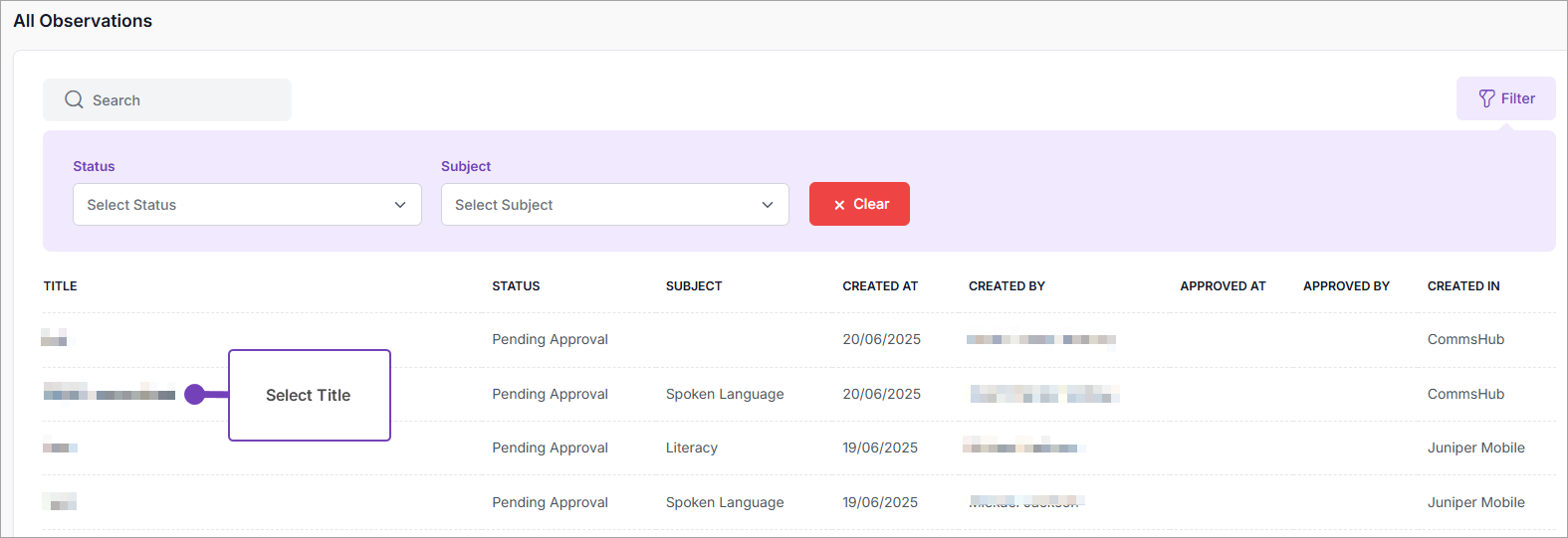 - From All Observations, select the Title of the Sonar Tracker observation you want to approve: