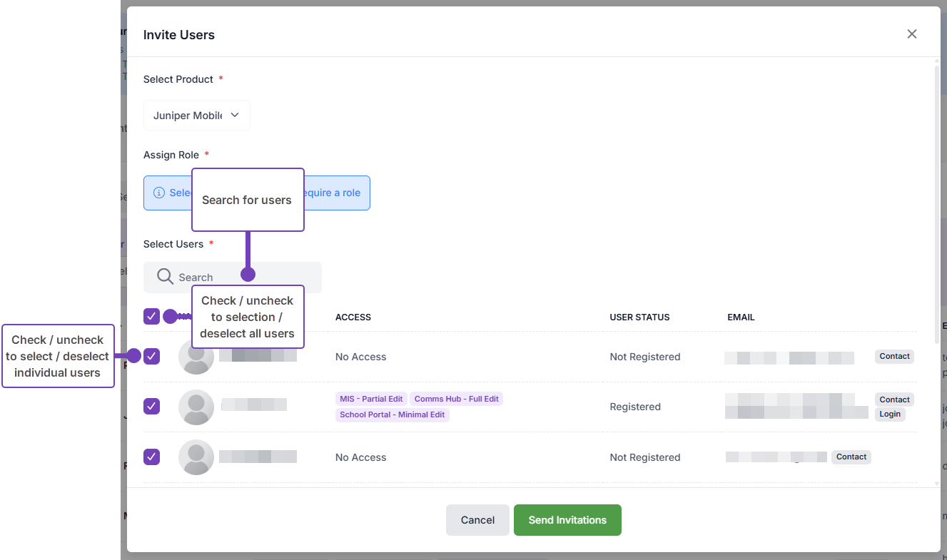 The Select Users pane updates to show a list of those staff members who are not currently users of the product you selected. Select one or more staff members to invite them: