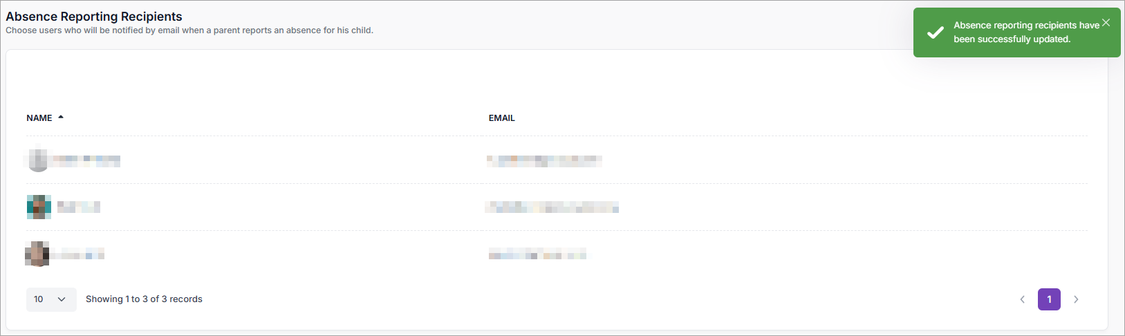 You selection is saved, the staff members are added to the list of absence reporting recipients, and you are returned to the Absence Reporting Recipients page. A message confirms your successful update: